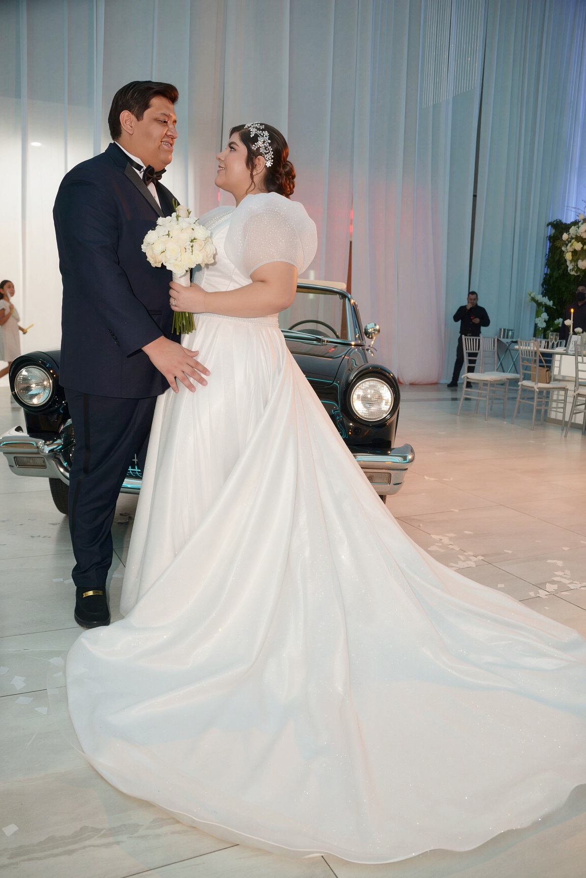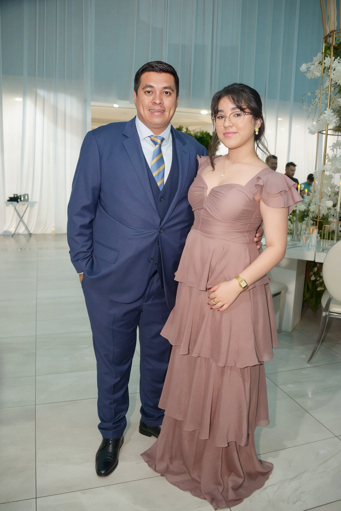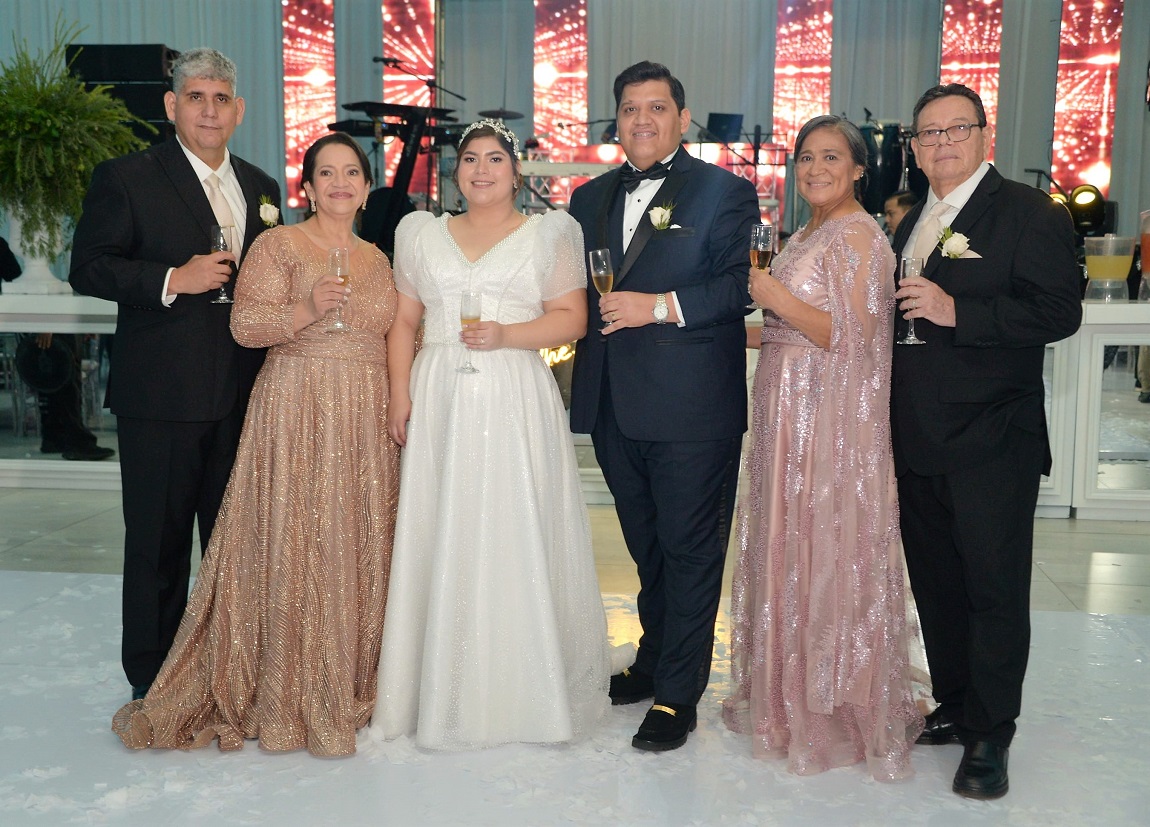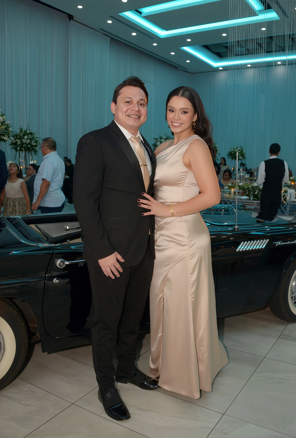 Posteriormente, los recién casados sorprendieron a sus invitados al llegar al salón Napoleón del Centro de Convenciones en un elegante auto clásico descapotable. La velada continuó con el tradicional brindis de los padres —Raúl Villanueva, Alma Odilia Pesquera, Edwin Cruz y Leslie Espinal— y el primer baile de la pareja, sellando una noche que fue el reflejo perfecto de su amor.