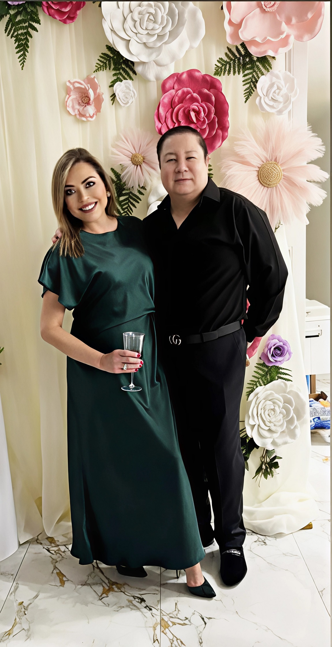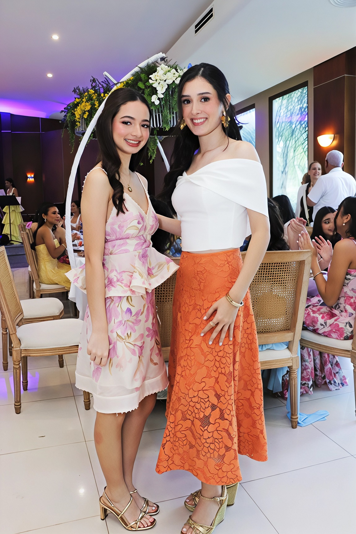 *.-La planificación del sarao, a cargo de Marcela Castellanos, sumergió a los invitados en una atmósfera exquisita decorada en tonos rojo y dorado. La estancia lució impecable con arreglos de rosas rojo vino, hortensias y follajes verdes que aportaron frescura y elegancia al recinto.