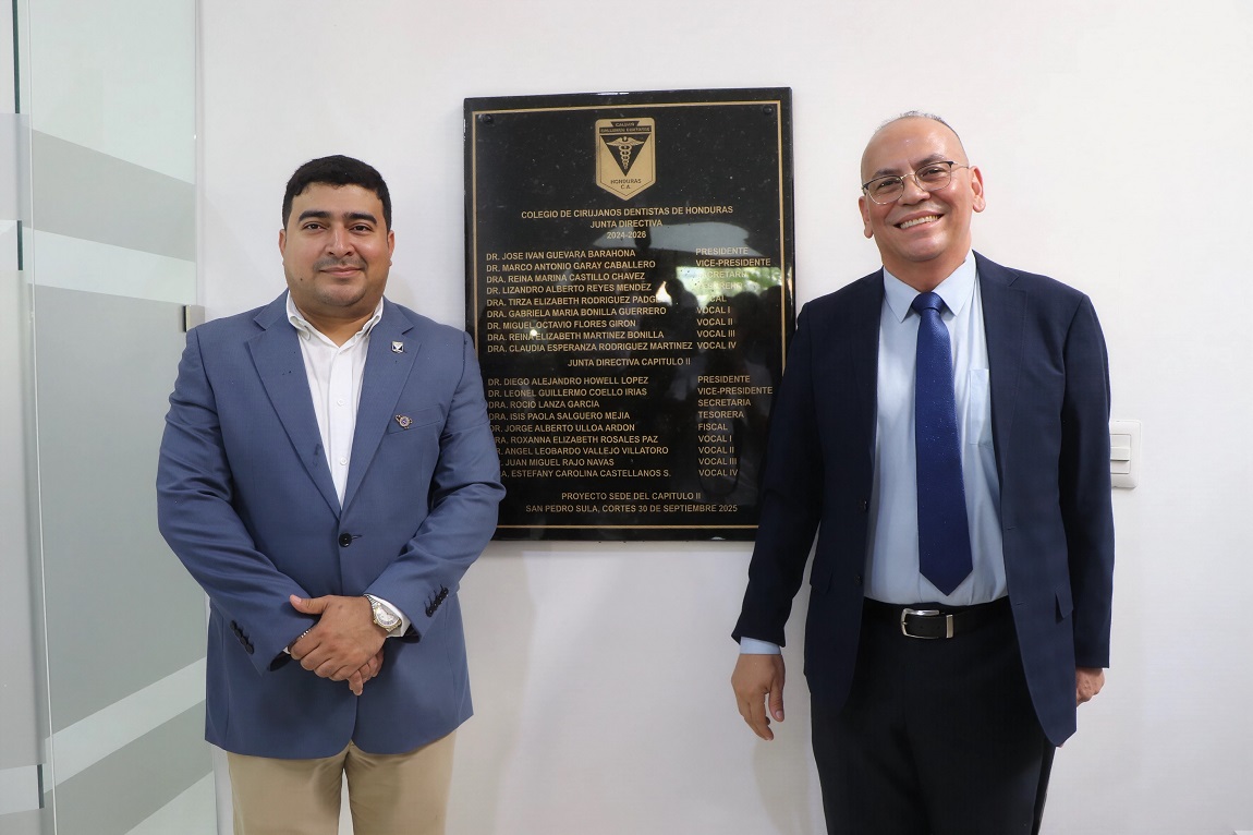 Diego Howell e Iván Guevara, presidentes regionales y nacionales, respectivamente, develaron una placa conmemorativa en las instalaciones recién inauguradas del Colegio de Cirujanos Dentistas de Honduras, capítulo #2.