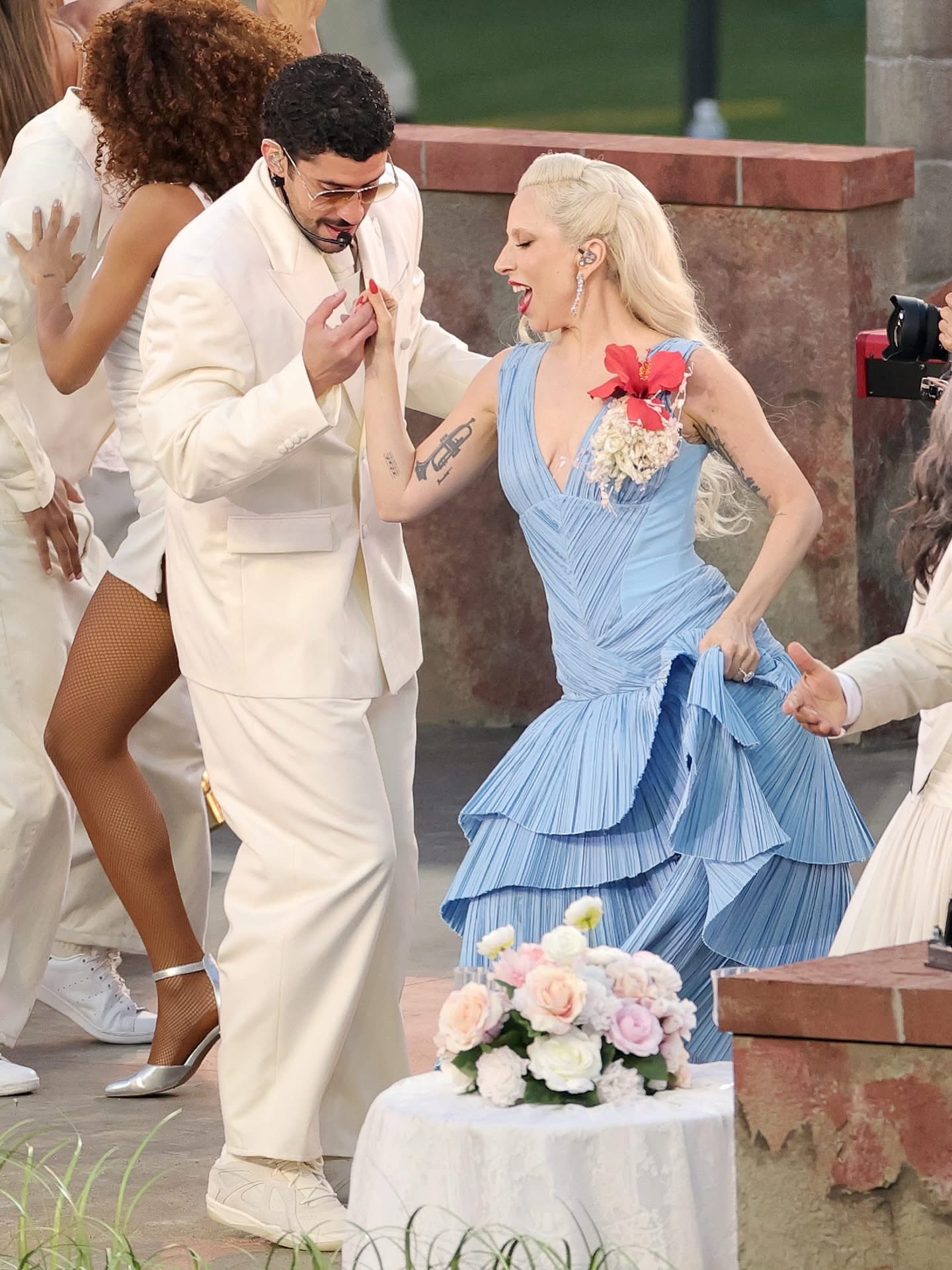 Lady Gaga, que cantó en inglés, fue la gran invitada sorpresa sobre un decorado con postales emblemáticas puertorriqueñas, como plantaciones de caña, carritos de comida y señores jugando al dominó.