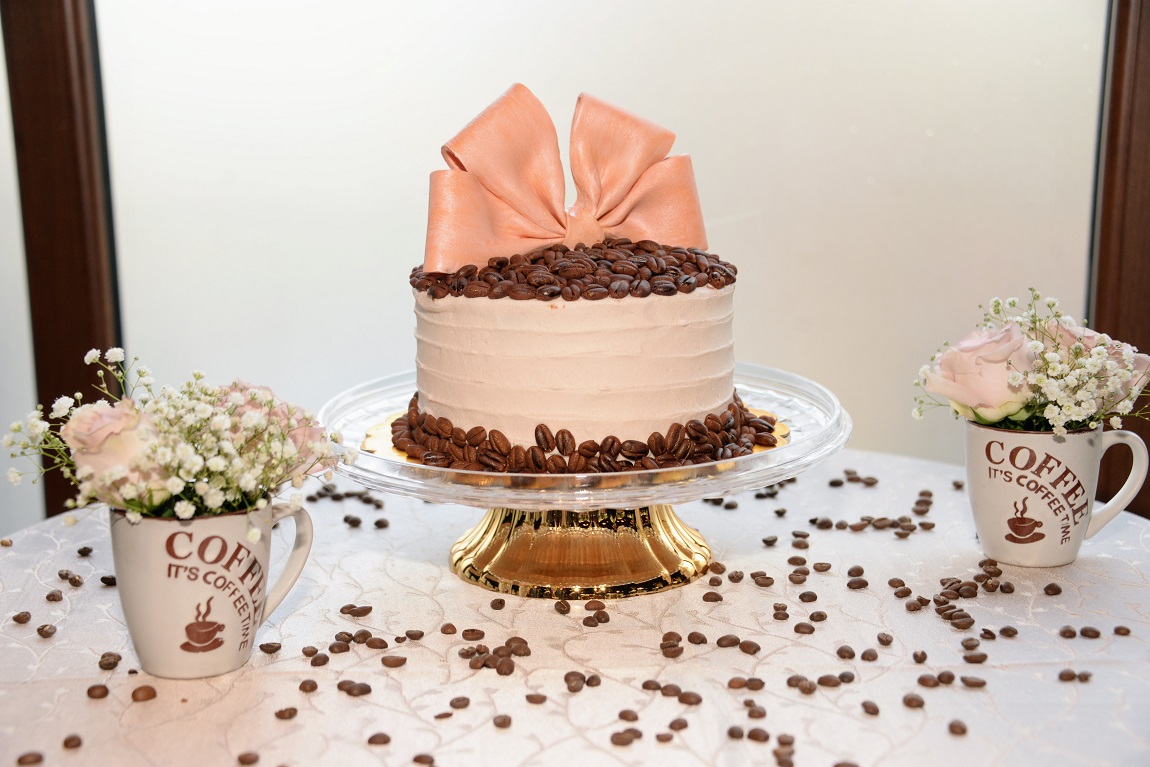 El deleite visual y gustativo alcanzó su punto máximo con el pastel de celebración, una pieza de repostería fina que emuló con maestría la temática de la tarde. El diseño, inspirado en los matices y la calidez del café, se convirtió en el centro de atención de la mesa principal, fusionando el arte culinario con el hilo conductor del evento.