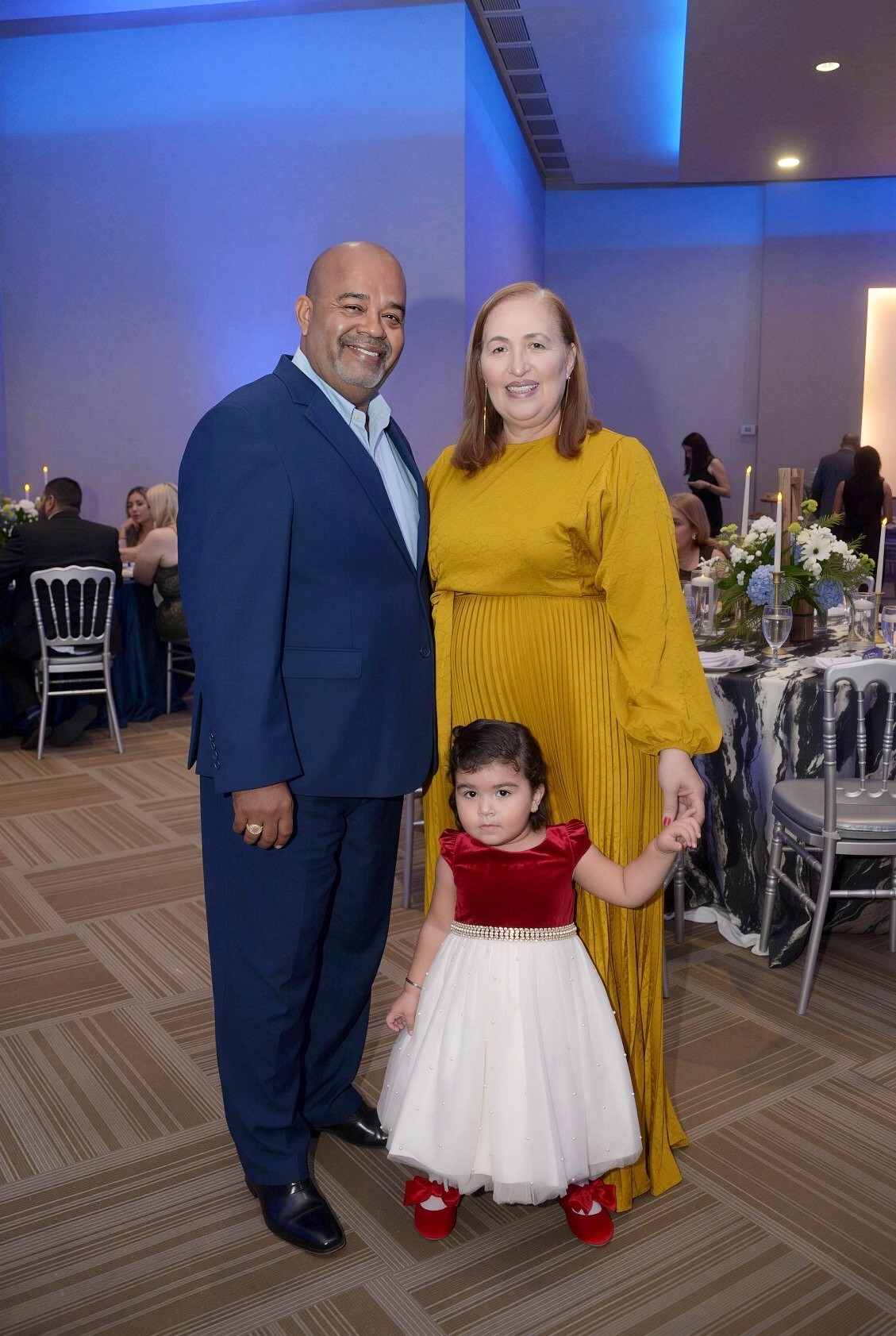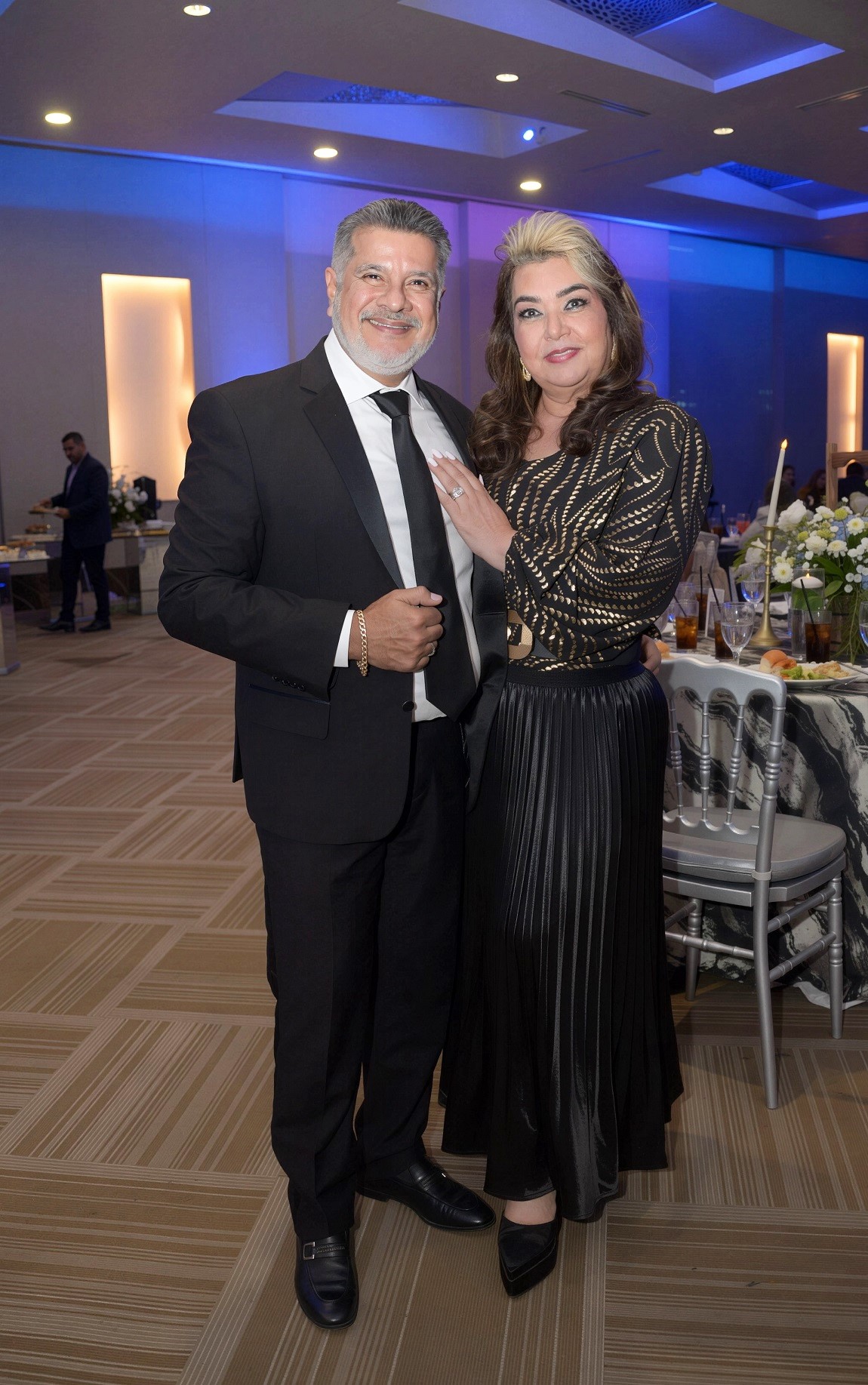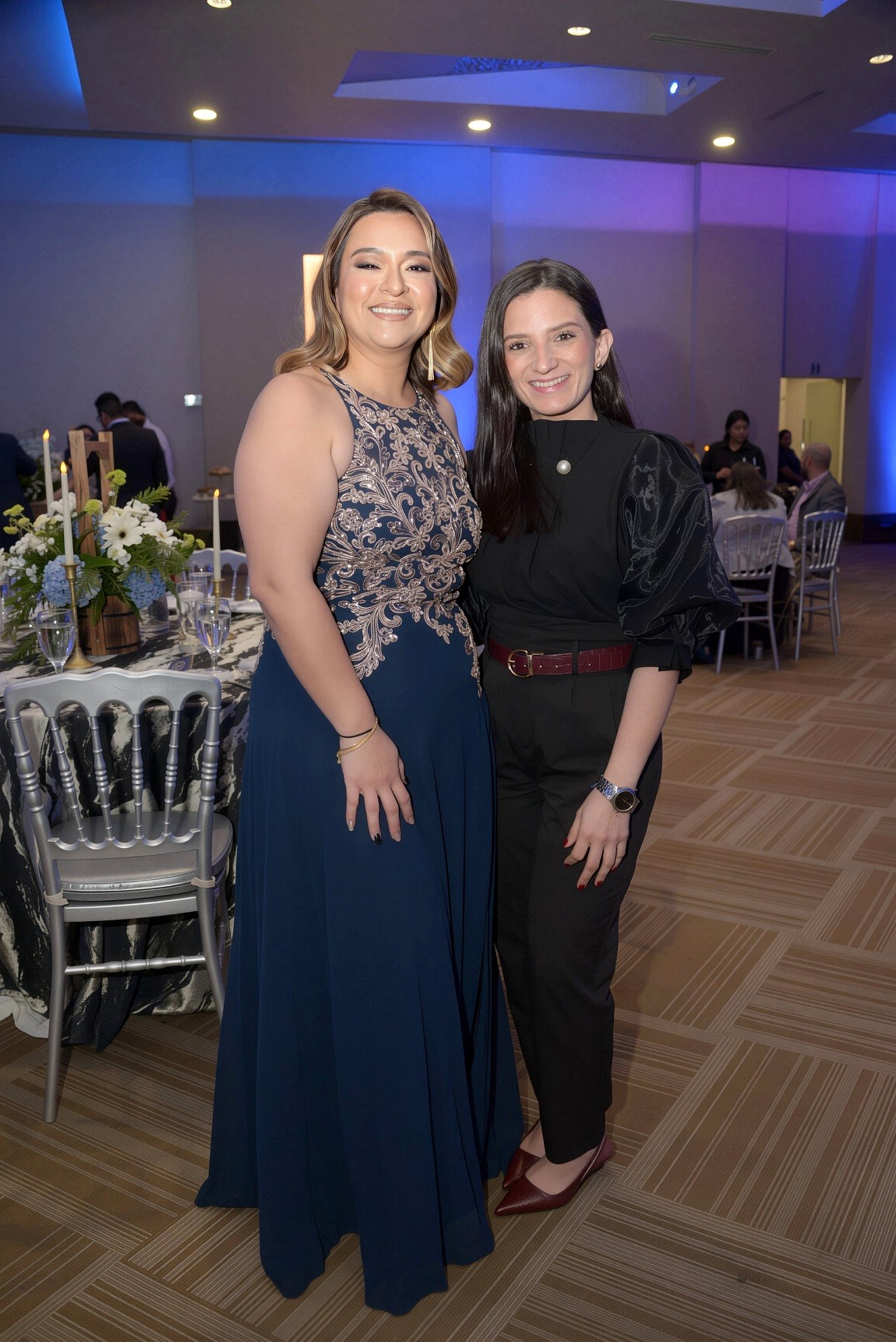 La cita tuvo lugar en el salón Jerusalem del Club Hondureño Árabe, el cual fue transformado para la ocasión con una propuesta estética sobria y original. La decoración, basada en una paleta de tonos azul profundo, negro y destellos dorados, estuvo bajo la experta dirección de su hija, Judith Aguilar, y su firma DG Wedding.