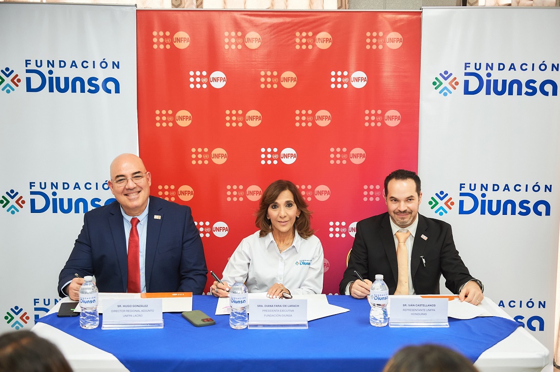 La firma del documento de cooperación se llevó a cabo en las oficinas de Diunsa en esta ciudad, contando con la presencia de Hugo González, Director Regional Adjunto, UNFPA para Latinoamérica y El Caribe (LACRO); Iván Castellanos, representante del UNFPA en Honduras y Diana Faraj de Larach, Presidenta Ejecutiva de Fundación Diunsa, así como ejecutivos de ambas partes.