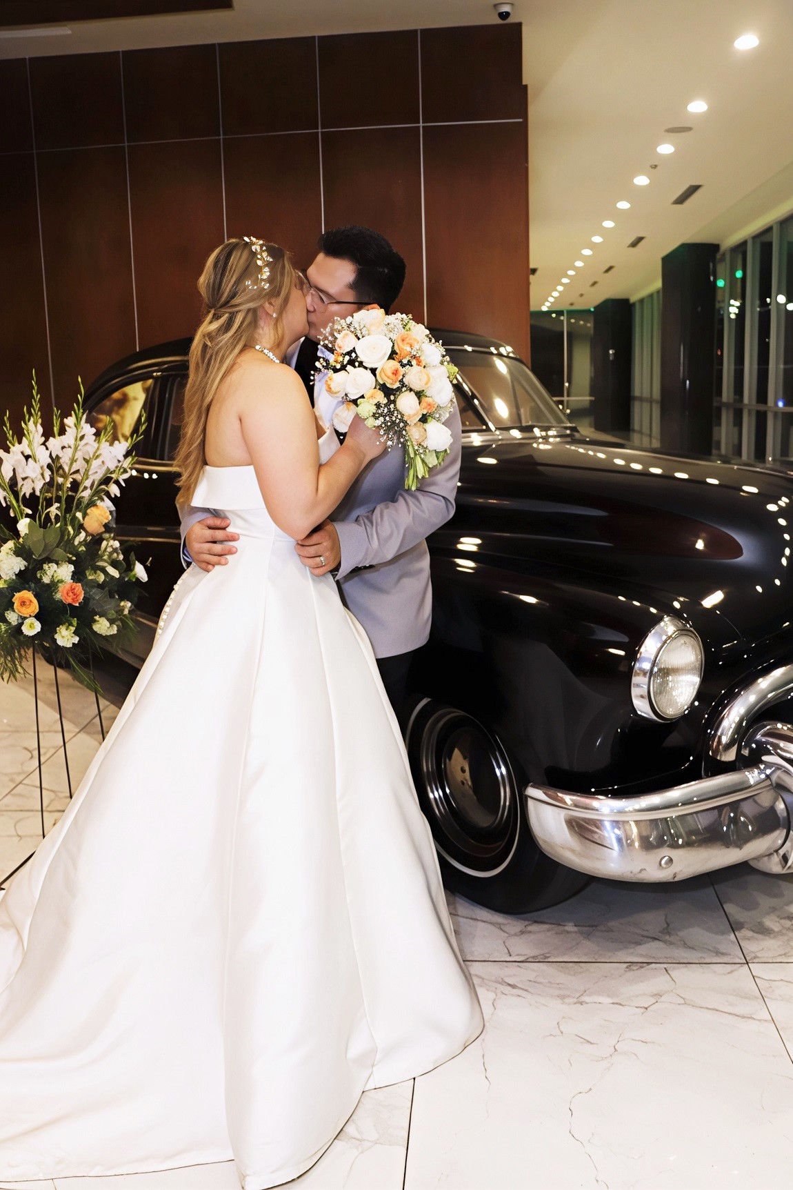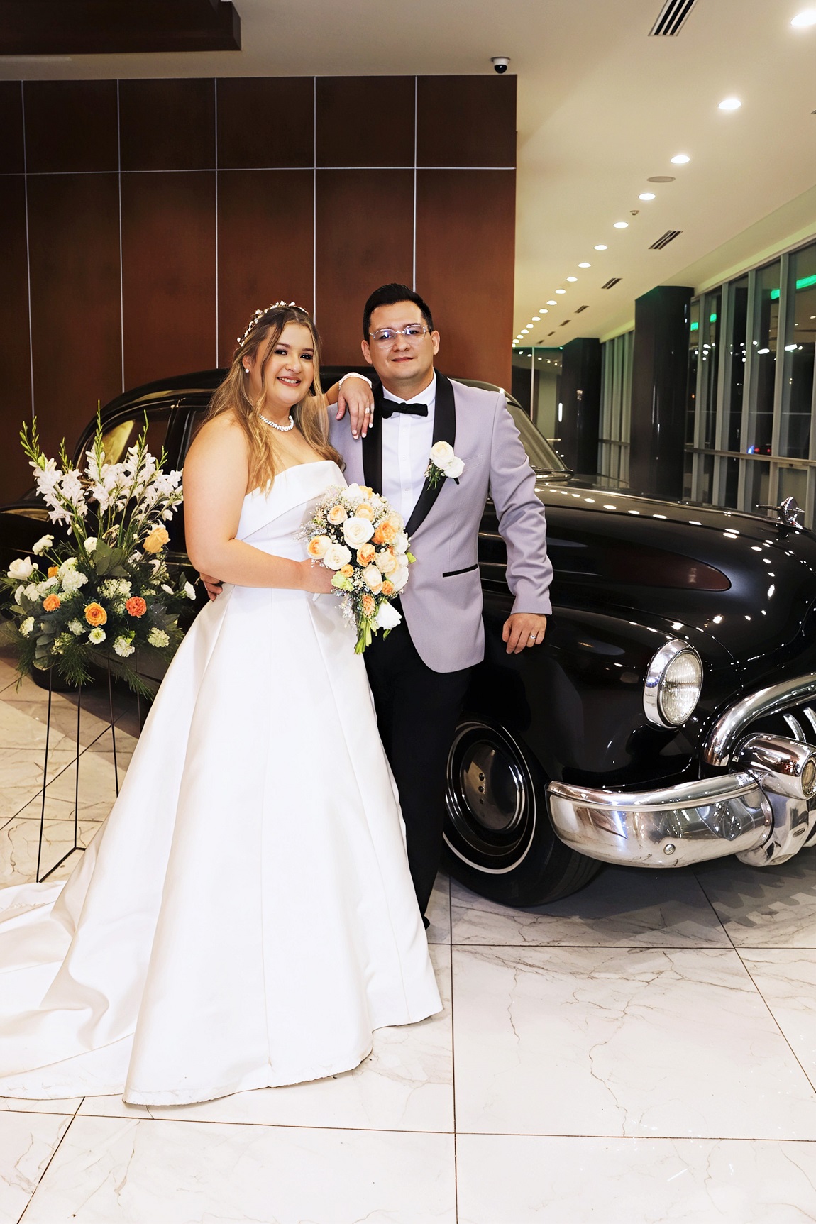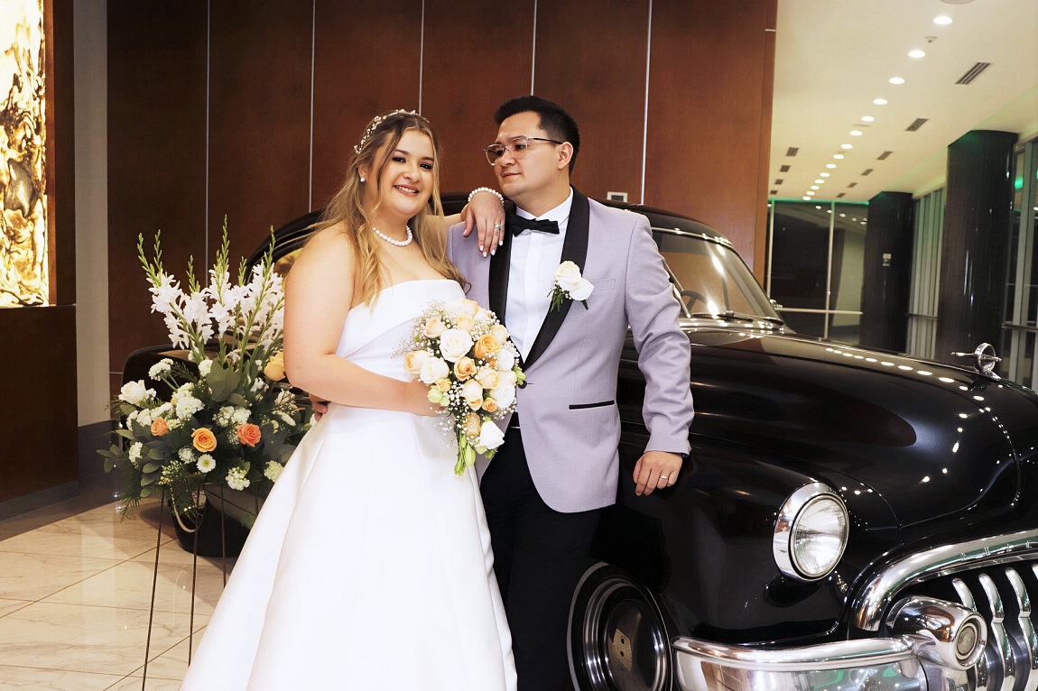 La novia cautivó a los presentes con un diseño exclusivo en blanco puro, complementado por un bouquet de rosas y claveles en tonos nude. A su lado, Gerardo lució impecable con un moderno traje bitono en gris y negro, logrando una armonía visual perfecta.