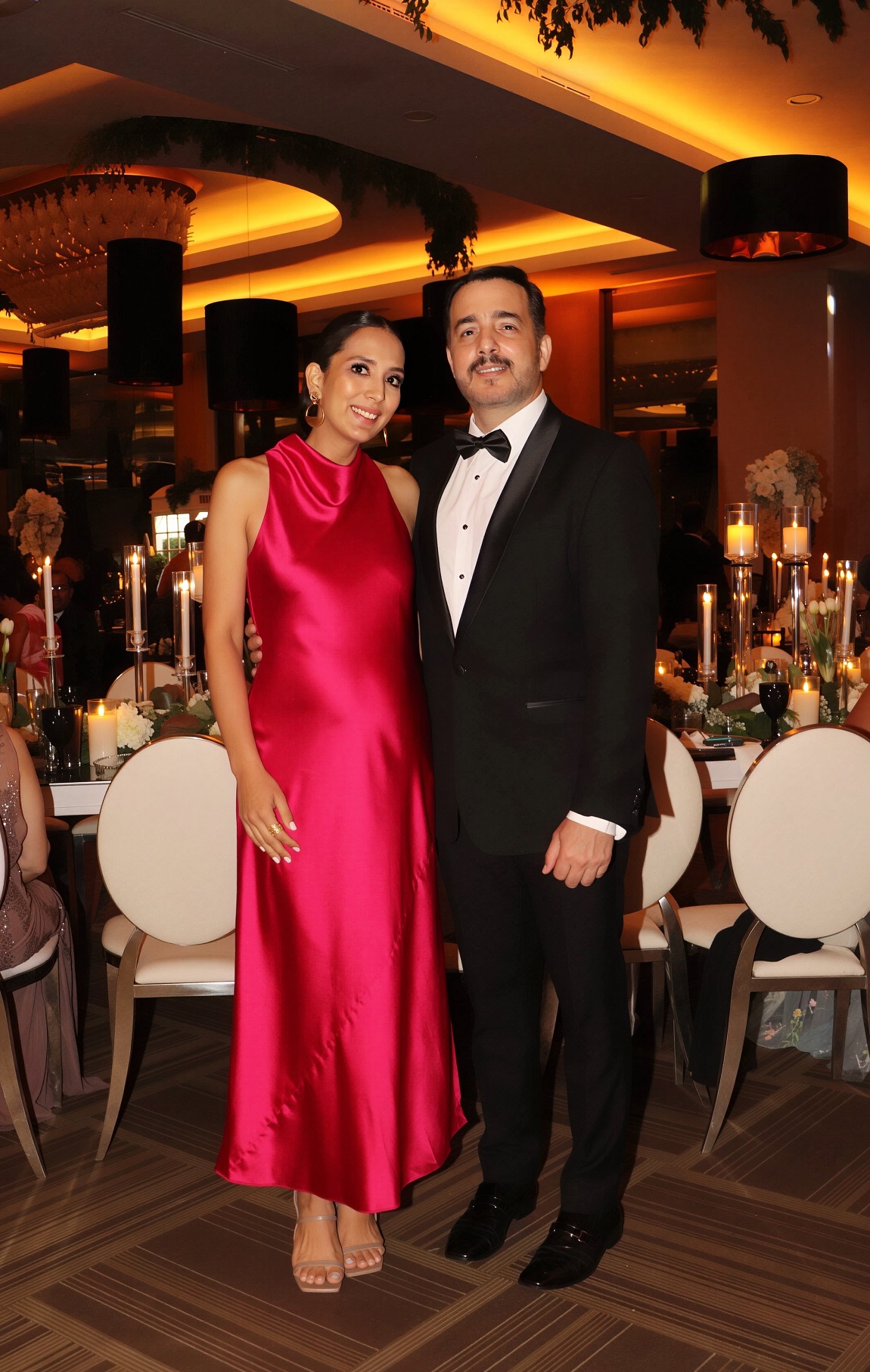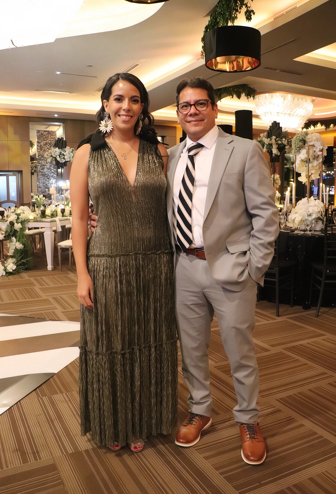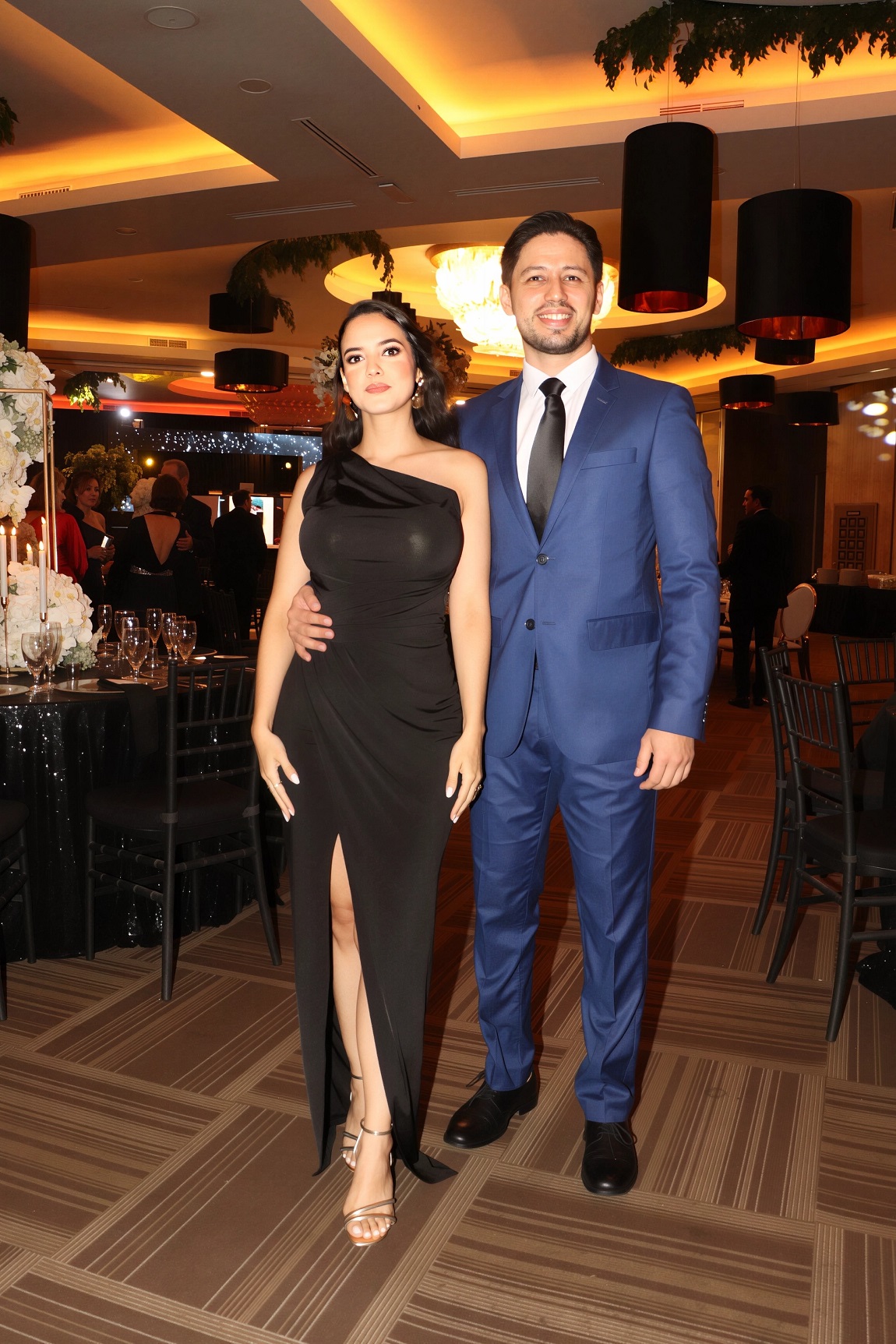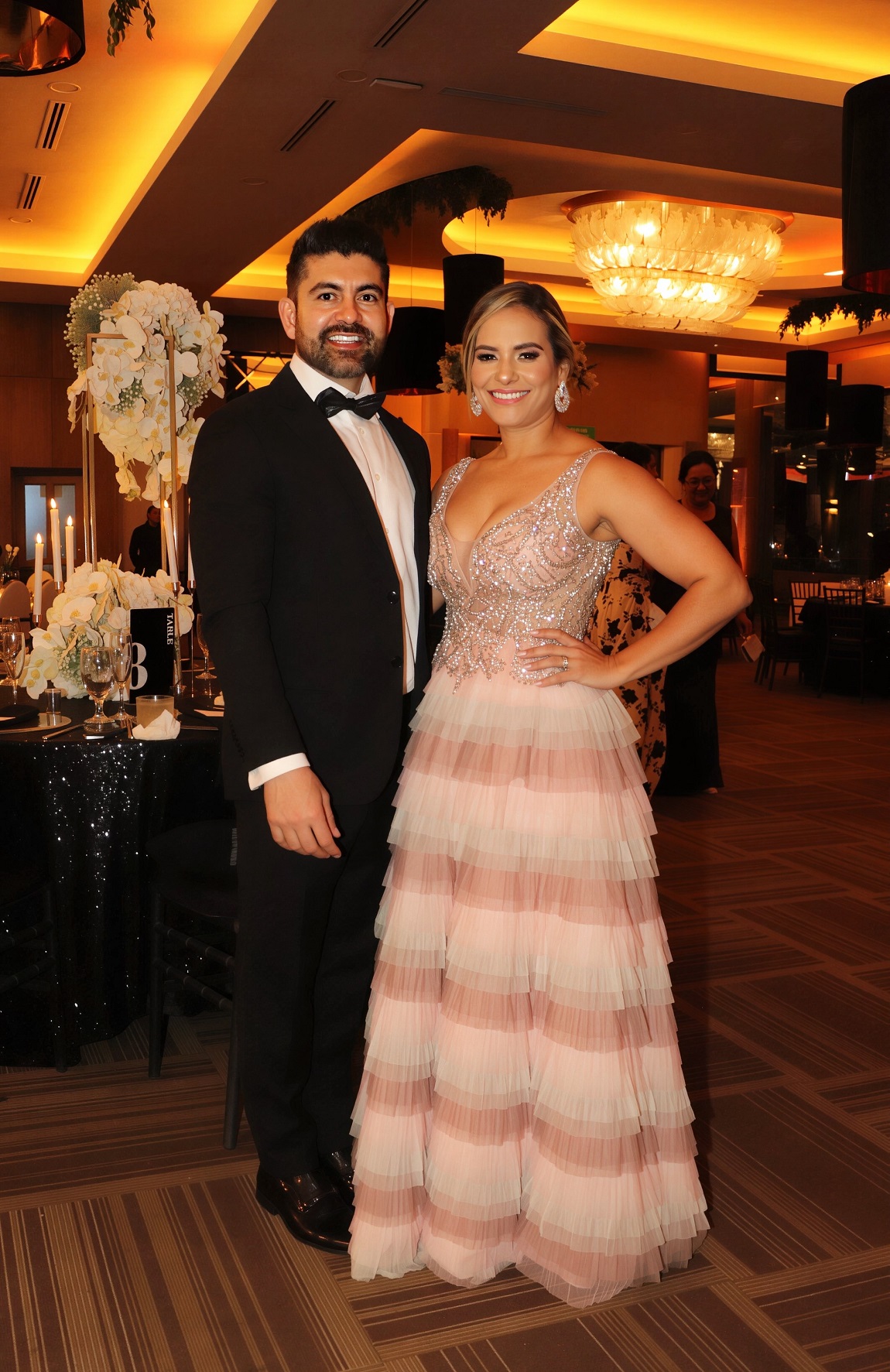 La decoración, una deslumbrante creación de Elías Del Cid, fue un derroche de elegancia: combinó ambientes con una sofisticada apuesta floral en blanco, dorado y negro, complementada con abundante follaje, imponentes candelabros, elegantes lámparas y una cálida iluminación.