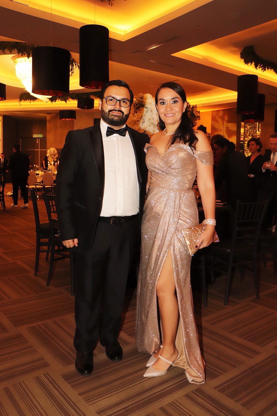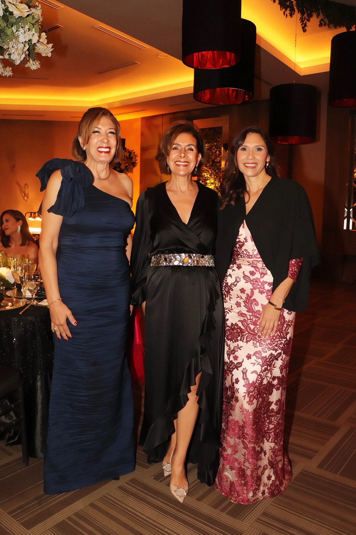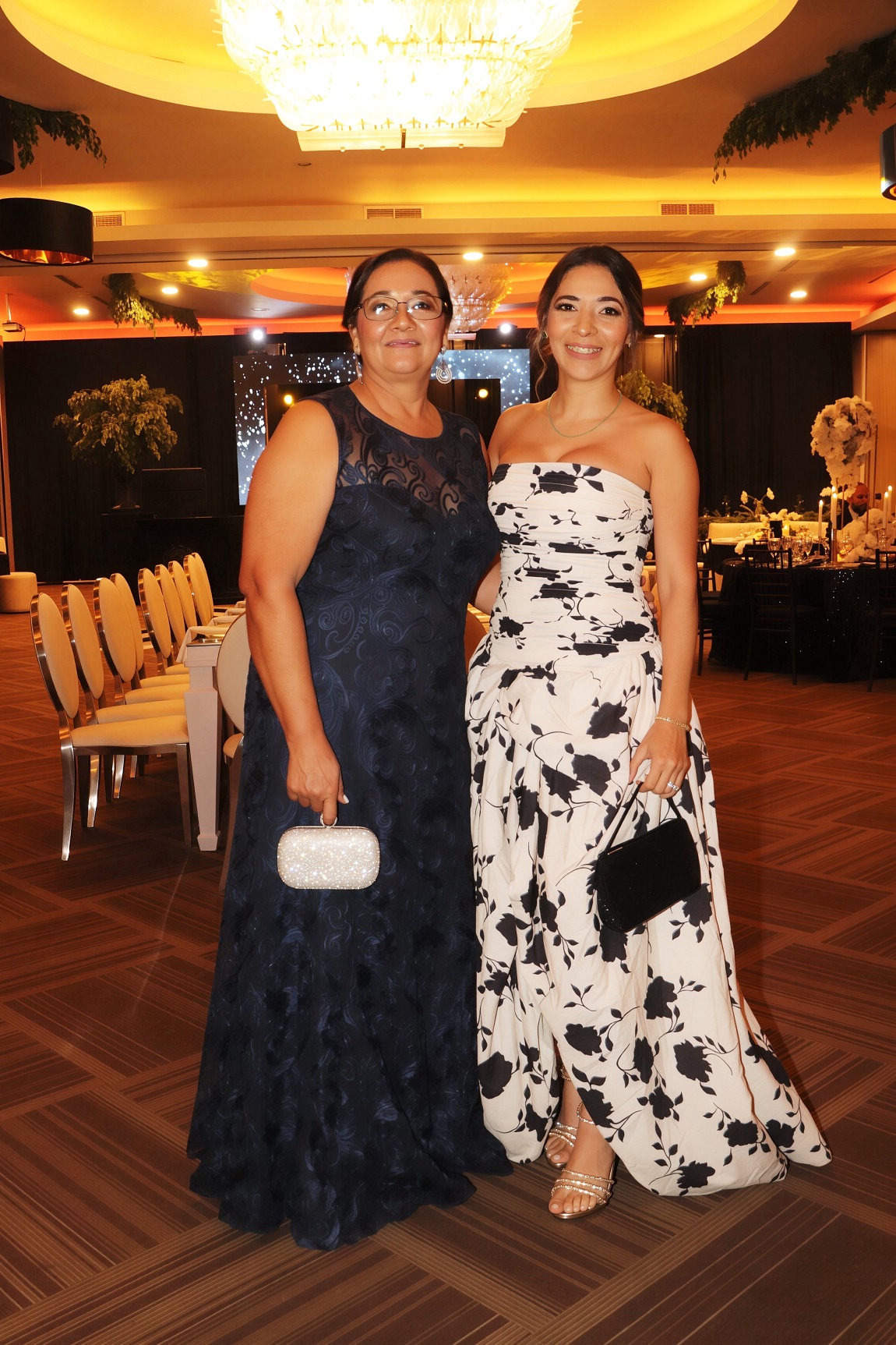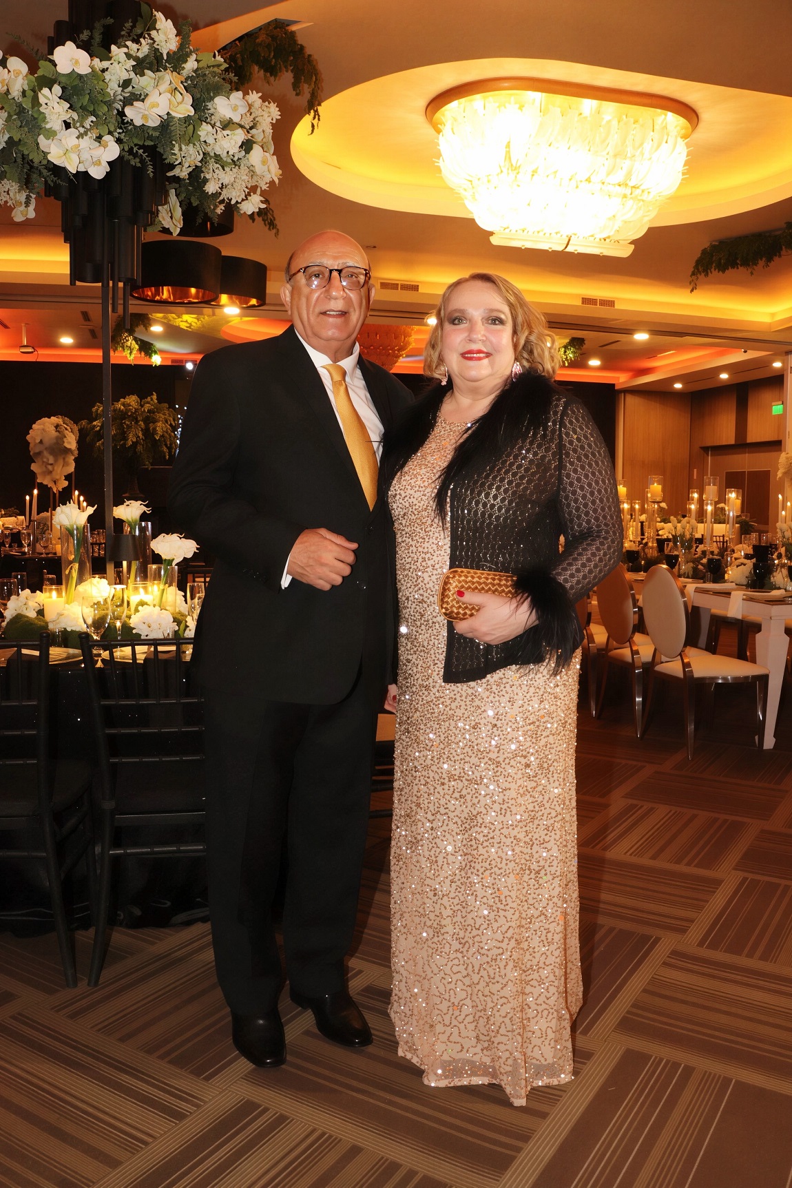 La decoración, una deslumbrante creación de Elías Del Cid, fue un derroche de elegancia: combinó ambientes con una sofisticada apuesta floral en blanco, dorado y negro, complementada con abundante follaje, imponentes candelabros, elegantes lámparas y una cálida iluminación.