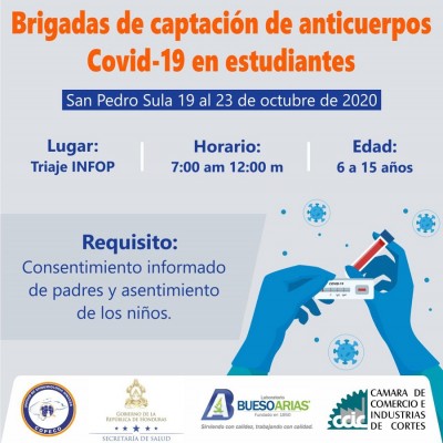 San Pedro Sula. – En coordinación con la Unidad de Epidemiologٕía de Sinager /Copeco, la Cámara de Comercio e Industrias de Cortés (CCIC), Laboratorio Bueso Arias y las Regiones Sanitarias de San Pedro Sula y Cortés, se desarrollarán brigadas mediante pruebas de anticuerpos totales a mil niños del departamento de Cortés en edad estudiantil de 6 a 15 año, iniciando el próximo lunes 19 de octubre.