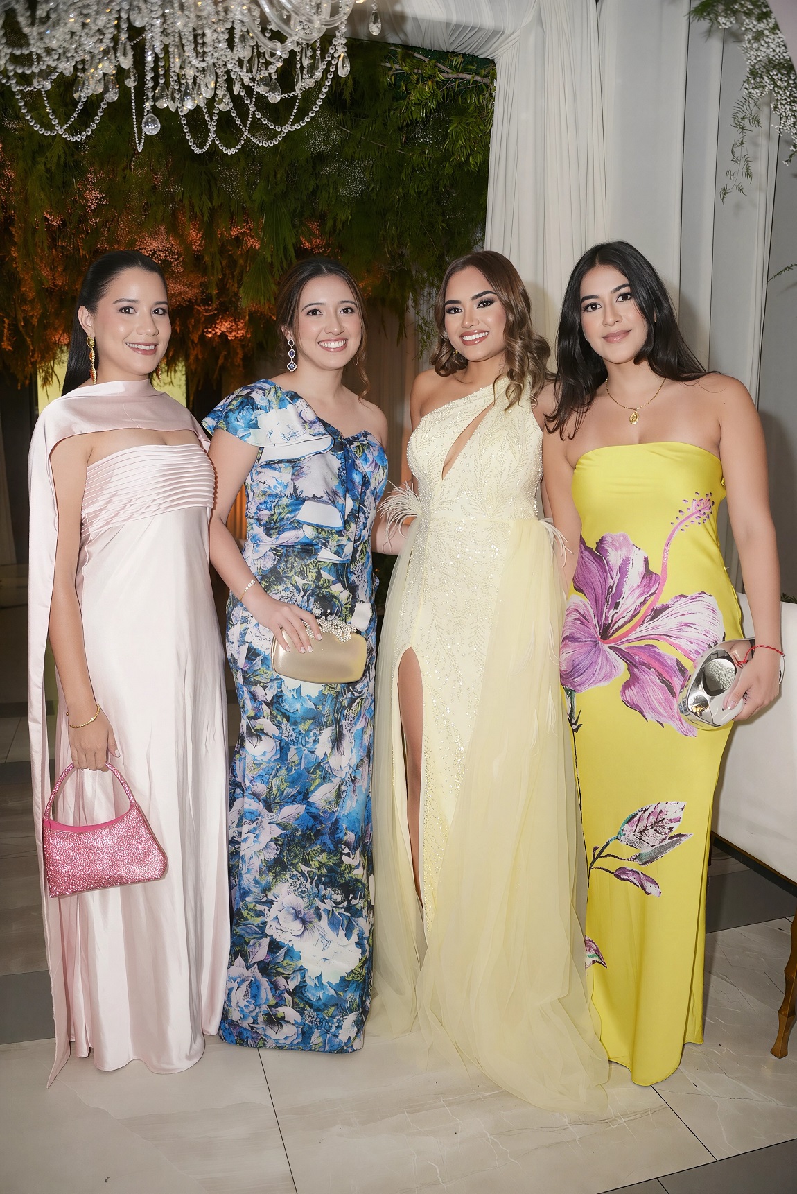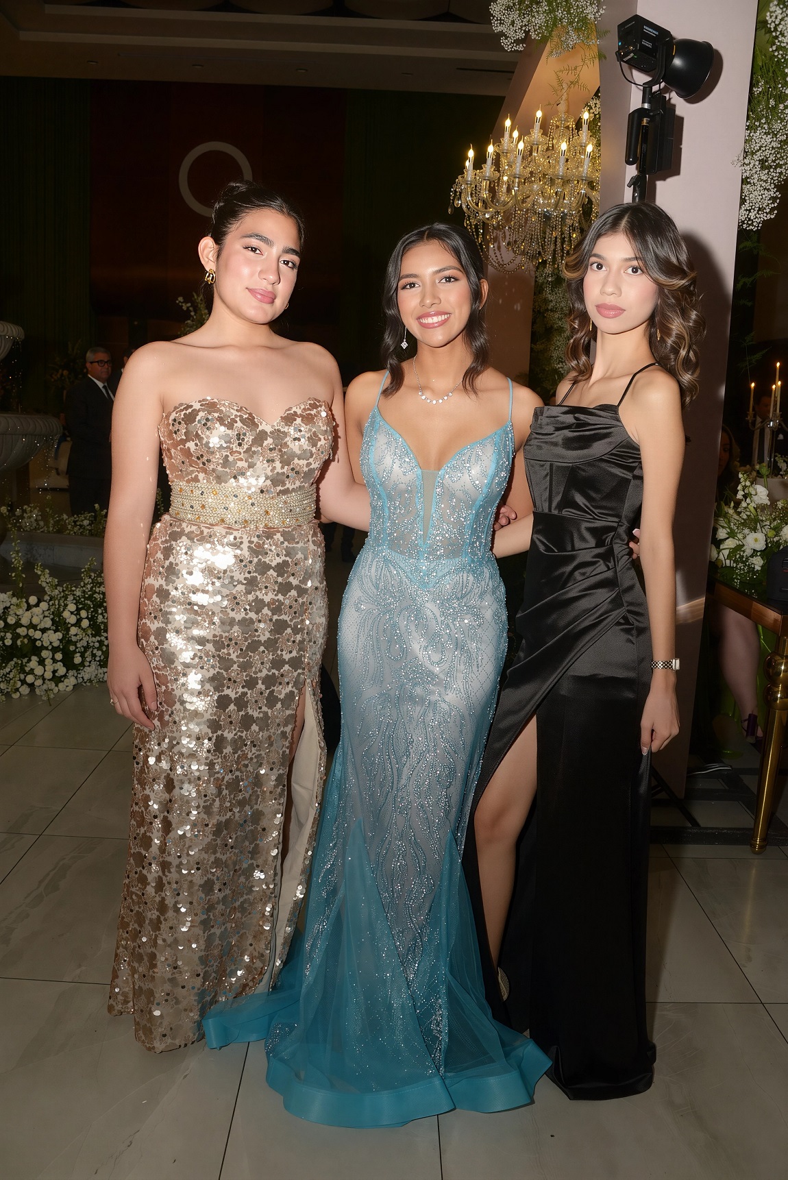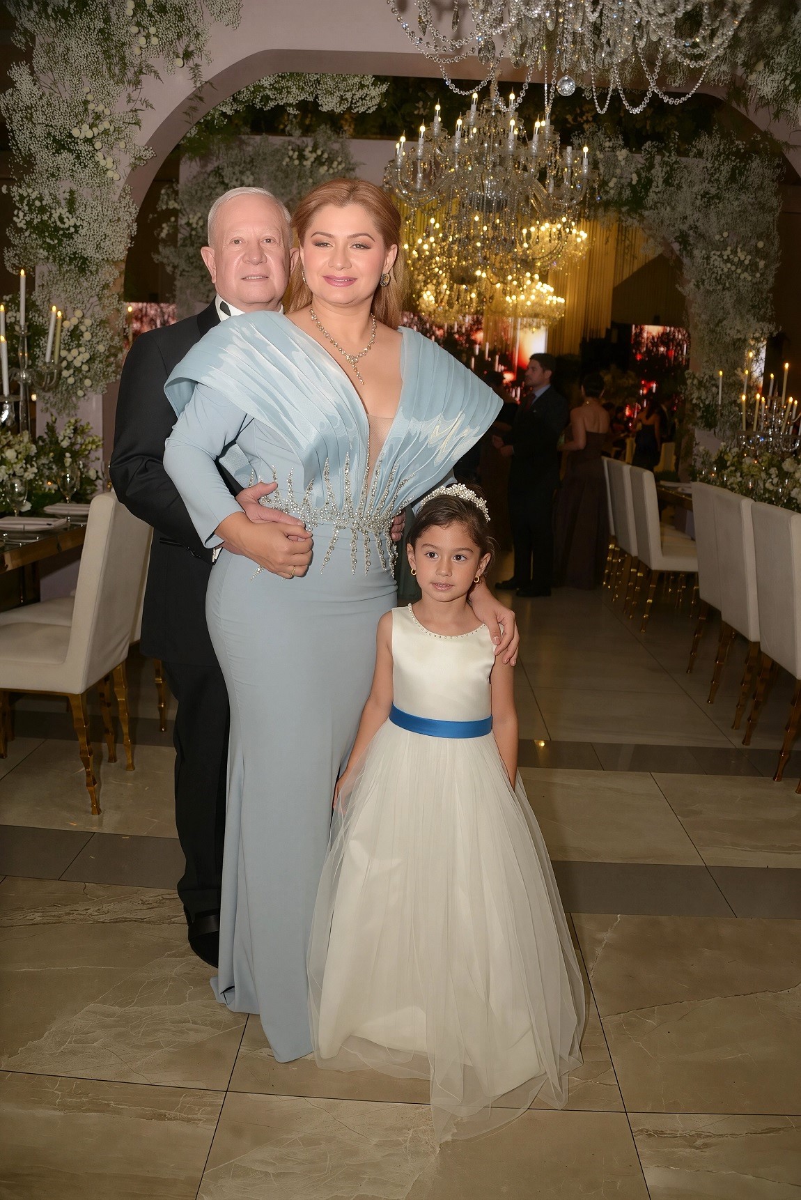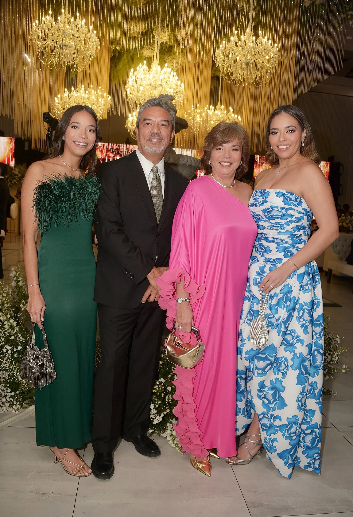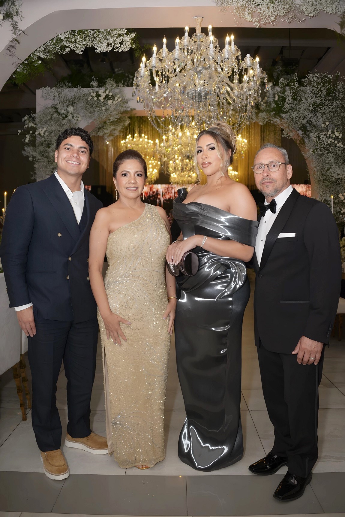 El montaje decorativo fue un deleite para los sentidos: una escenografía repleta de exuberante follaje y flores naturales en un inmaculado color blanco, realzado por la majestuosidad de imponentes lámparas candelabros y la caída de largos cortinasjes. La belleza del entorno se convirtió en el escenario perfecto para las infaltables fotografías en familia.