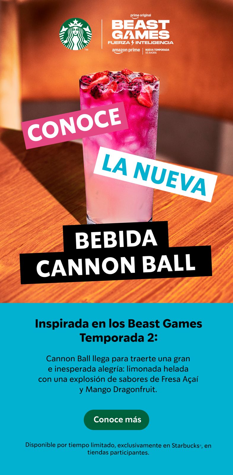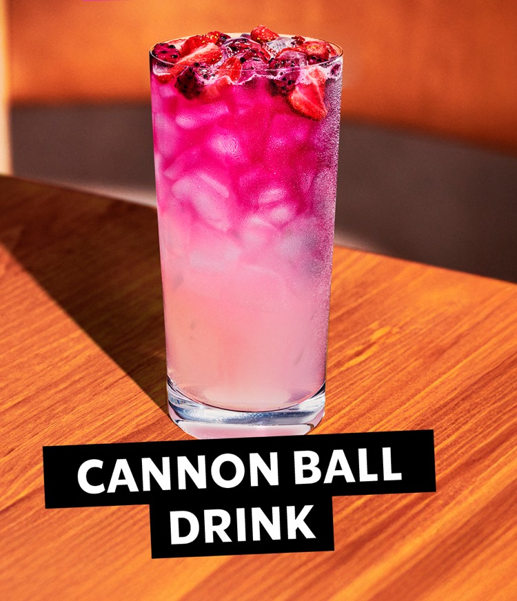 Creada por baristas de Starbucks e inspirada en el icónico Cannon Ball Challenge, esta bebida es una limonada intensa y ligeramente ácida. Su receta combina: Strawberry Açaí y Mango Dragonfruit Refreshers®, inclusiones de fruta en cascada, servida intensamente fría.