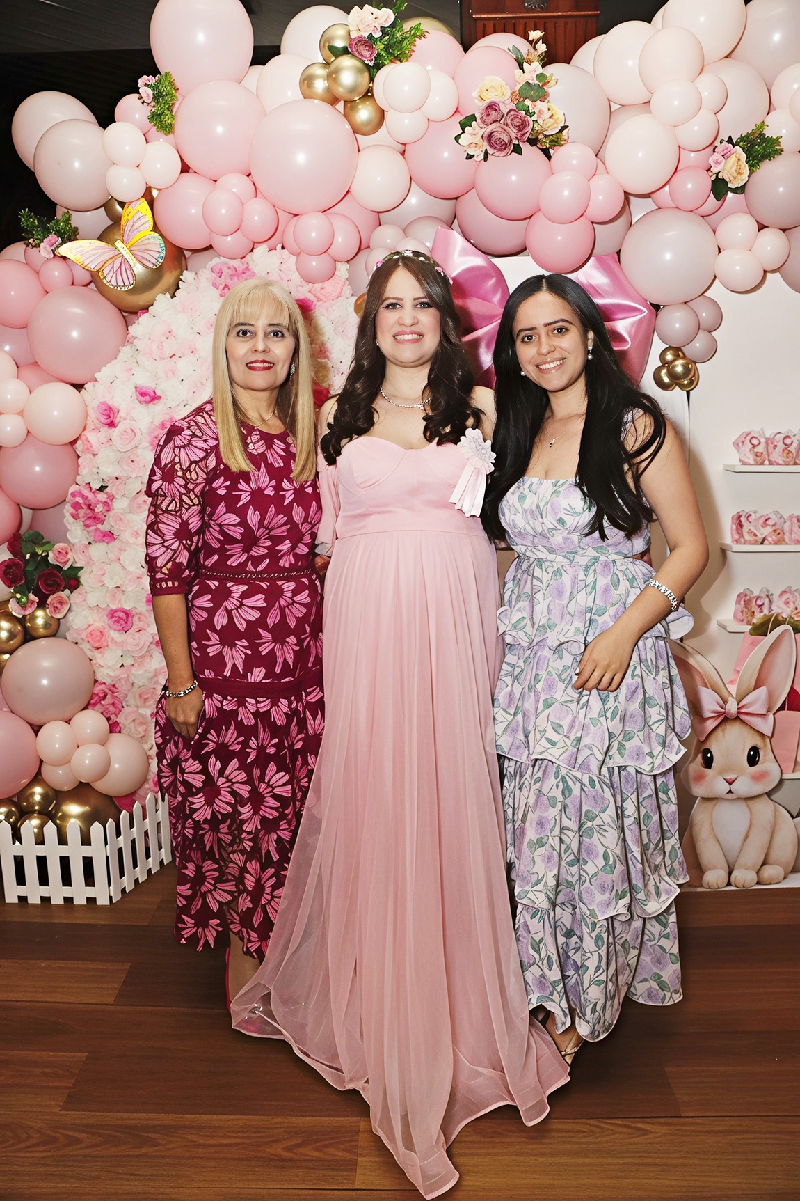 La estancia destacó por una impresionante guirnalda de globos en tonos rosa, blanco y pinceladas en oro, que junto a figuras de tiernos conejos de inspiración primaveral, crearon el marco perfecto para las fotografías del recuerdo.