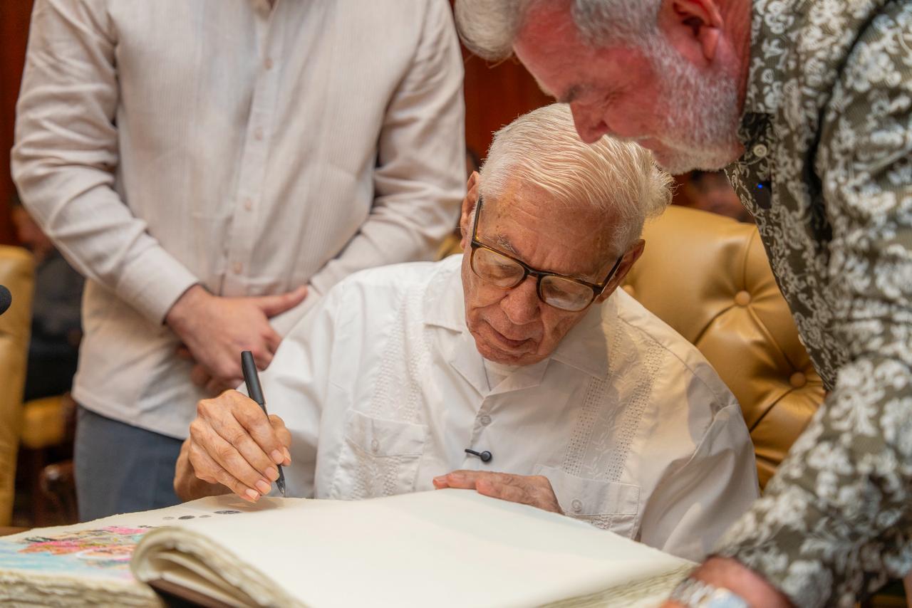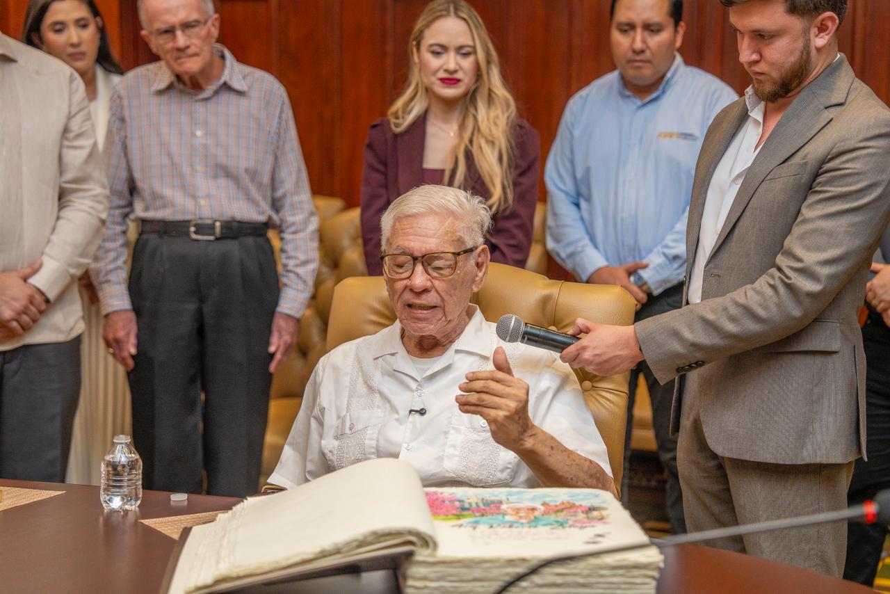 Acompañado por familiares y amigos, entre ellos su esposa, la abogada María Margarita de Elvir, y su primo hermano, el ingeniero José María Elvir, el arquitecto Elvir Zelaya firmó el Libro de Visitas Distinguidas, un acto simbólico para quien ya es, por derecho propio, un ciudadano ilustre de la capital industrial.