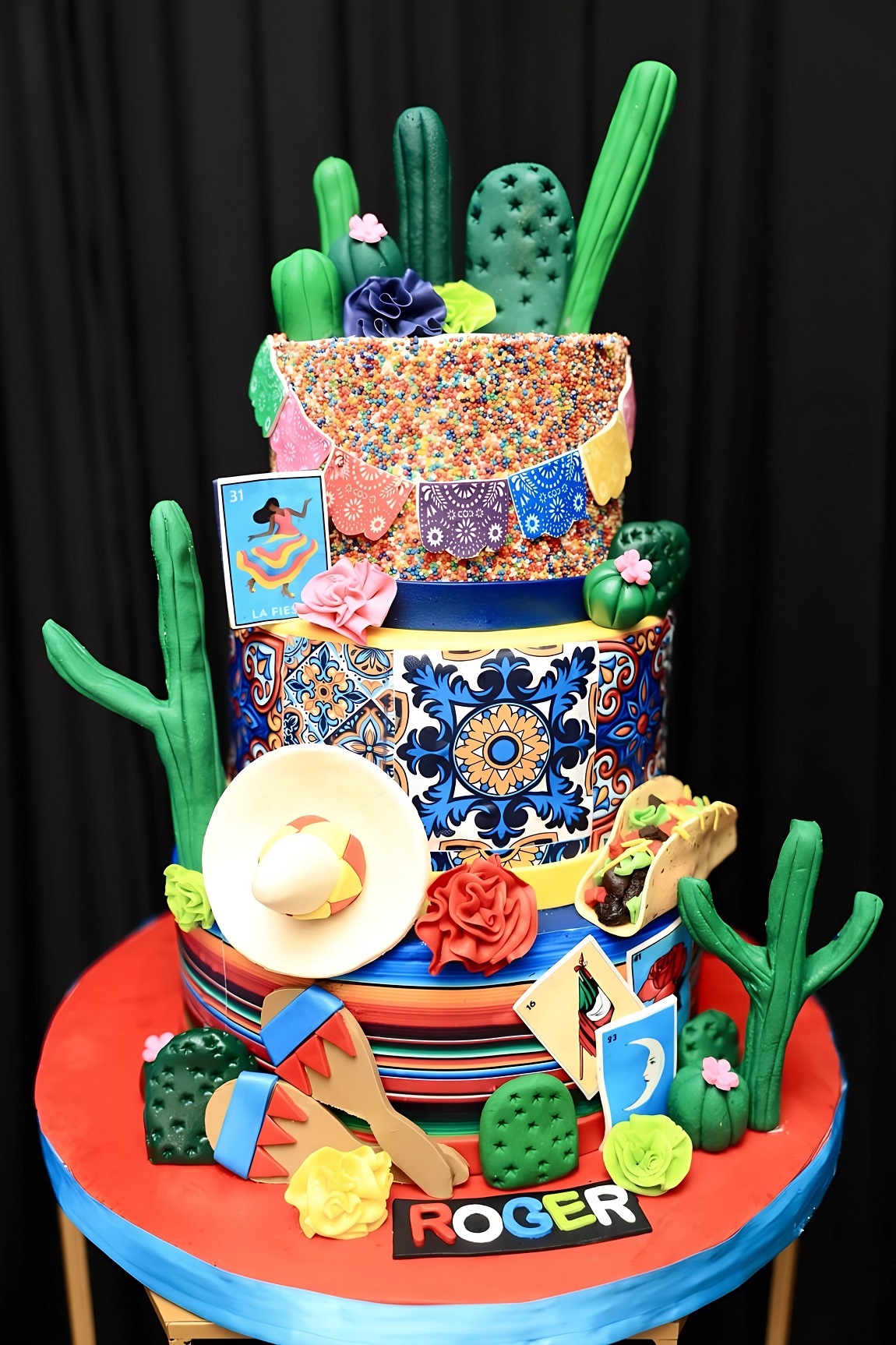 Como pieza central de la mesa de postres, el colorido pastel reflejó con maestría la temática de la celebración, fusionando arte y tradición.Talento en escena: Colaboradores de UTH interpretando los momentos cumbres del cine de oro mexicano en honor a don Roger D. Valladares.Emma de Valladares en una de sus interpretaciones románticas a su amado esposo don Roger D. Valladares.