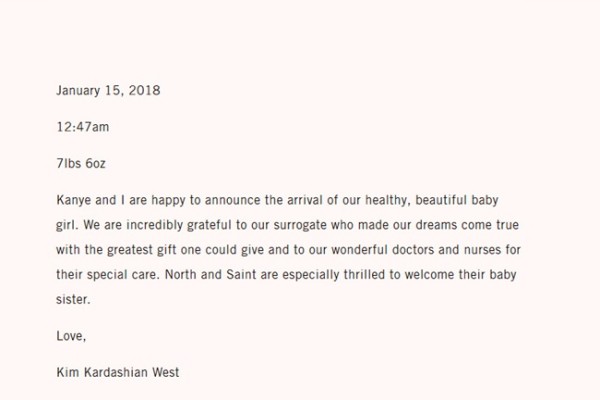“Estamos increíblemente agradecidos con la madre nuestra madre sustituta que ha hecho realidad nuestros sueños con el mejor regalo que alguien podría dar y con nuestros maravillosos médicos y enfermeras por su especial cuidado. North y Saint están especialmente emocionados de poder darle la bienvenida a su hermanita”, escribió.